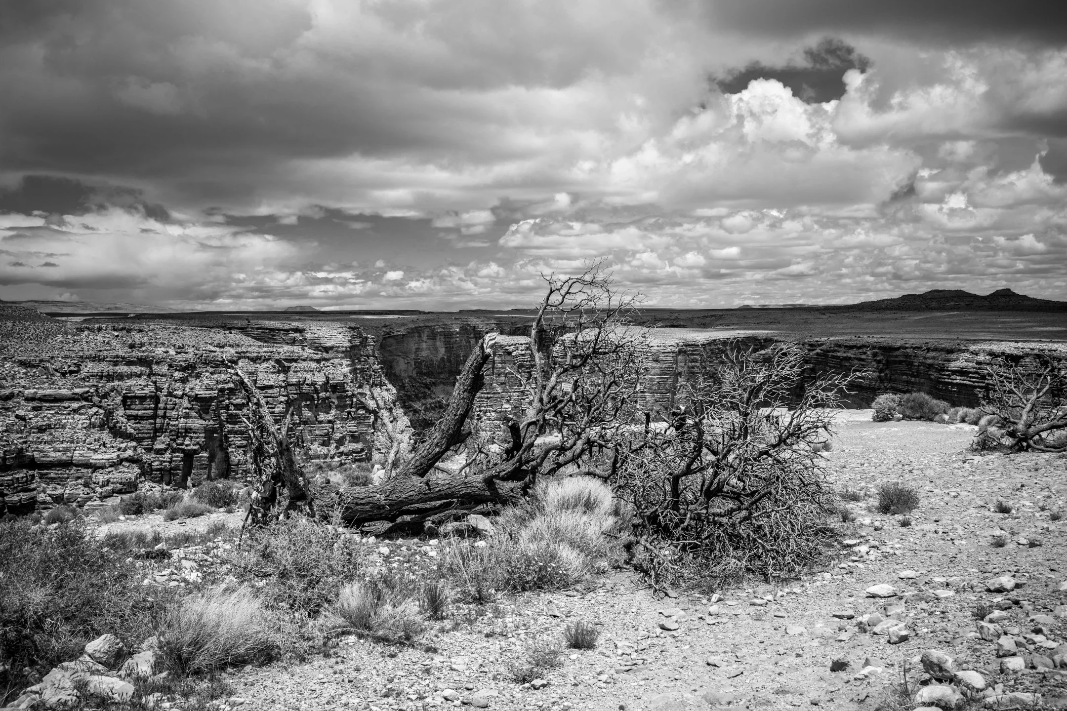 Taken in May of 2025, this striking black and white photograph captures the awe-inspiring grandiose majesty of the Grand Canyon in a way that feels both timeless and haunting. The image centers on a solitary, gnarled tree standing defiantly on the canyon's edge, its twisted branches reaching out to the harsh Arizona sun against the vast, rugged landscape. The tree, weathered by years of harsh desert conditions, serves as a poignant symbol of resilience amidst the canyon's unrelenting expanse.